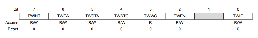 3) TWSTA : TWI START Condition I2C통신에서 마스터가 되고자 할 때 TWSTA비트를 1로 세팅합니다. TWI하드웨어는 버스가 사용 가능한지 확인하고 버스가 비어있으면 버스에서 START조건을 생성합니다. 그러나 버스가 비어 있지 않으면 TWI는 STOP 조건이 감지될 때까지 기다린 다음 버스 마스터 상태를 청구하기 위해 새로운 START 조건을 생성합니다.