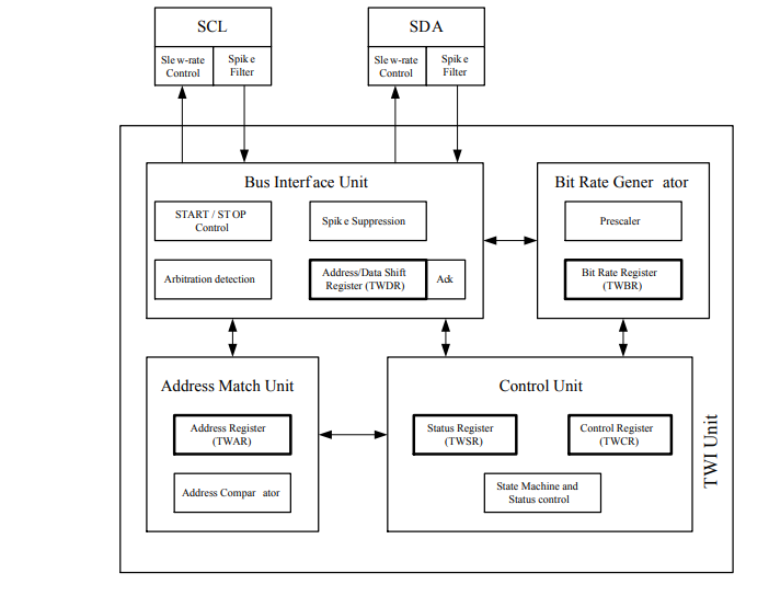 - Bus Interface Unit : START/STOP 컨트롤러 및 중재 감지 하드웨어가 포함, TWDR에는 전송할 주소 또는 데이터 바이트 또는 수신된 주소 또는 데이터 바이트가 포함되어있습니다. 이외에도 버스 인터페이스 장치에는 전송 또는 수신할 (N)ACK 비트가 포함된 레지스터도 포함되어 있습니다. 이 (N)ACK 레지스터는 애플리케이션 소프트웨어에서 직접 액세스할 수 없습니다. 그러나 수신할 때는 TWI 제어 레지스터(TWCR)를 조작하여 설정하거나 지울 수 있습니다. 송신기 모드에서 수신된 (N)ACK 비트의 값은 TWSR의 값으로 결정