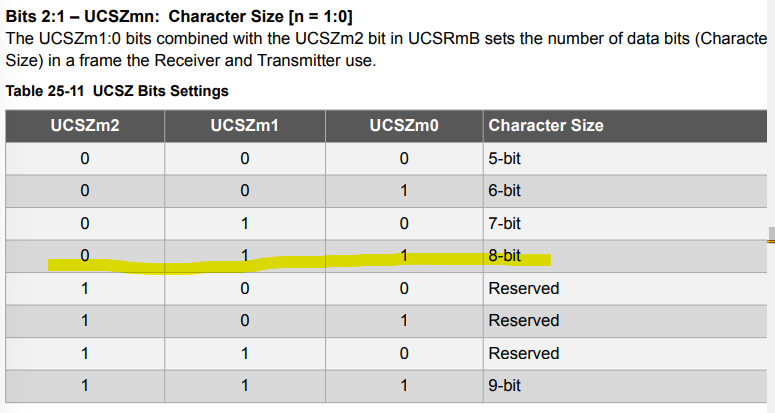 또한 8비트 데이터를 받기위해서 다음과 같이 설정해주면 최종적으로 UCSR0C 에는 0000_0110 의 비트가 쓰여지게됩니다.