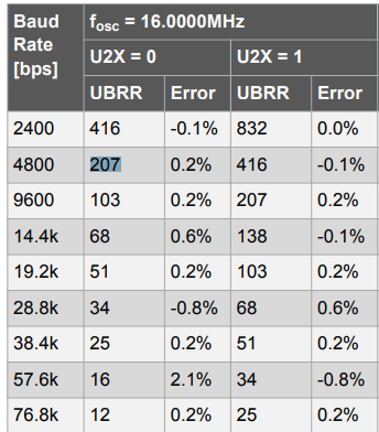 초기화 함수에서는 Baud Rate~~~, 우리가 사용할 BPS를 설정해줍니다 이때 아래 사진을 참고합니다. ATmega128A는 16Mhz 클록을 사용하므로 다음처럼 UBRR0L에 207을 설정해줍니다.