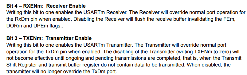 UCSRmB – USART Control and Status Register B : 마지막으로 데이터 송수신을 위해서 다음 레지스터에서 3,4번 레지스터의 비트를 1로 값을 써주면 모든 레지스터 설정이 종료됩니다.