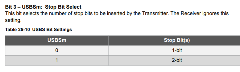 UCSRmC – USART Control and Status Register C : 또한 스탑 비트를 1 bit으로 설정하기 위해서 아래와 같이 설정해줍니다.