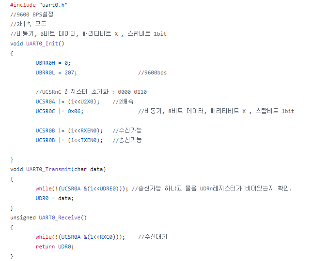 위 내용처럼 UART통신을 프로토콜을 위해서 각 레지스터들을 초기화, 송신, 수신 함수를 선언하였습니다.