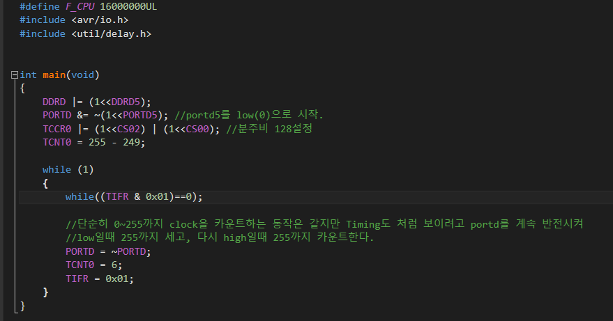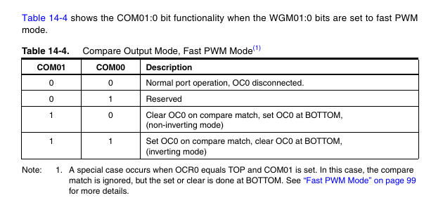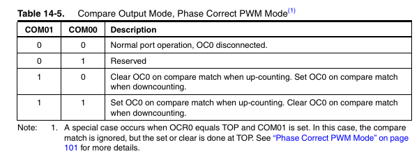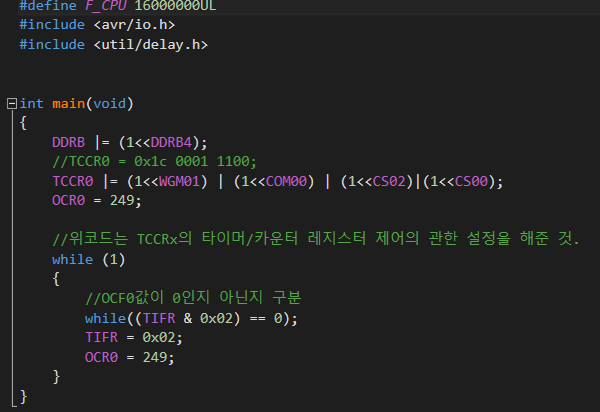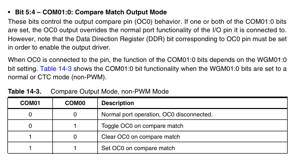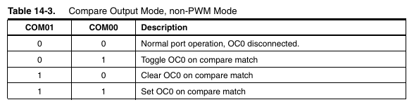 1<<COM00를 하여 OC0핀의 상태를 반전시켰다. 즉, Compare Match가 발생하면 OC0핀이 반전된다는 의미이다.