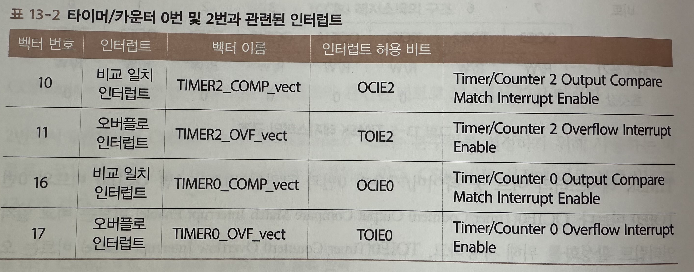 - 인터럽트 또한 각각 타이머/카운터마다 다르며, 그 종류 (오버플로우, 아웃풋 컴페어) 등 또한 많다.