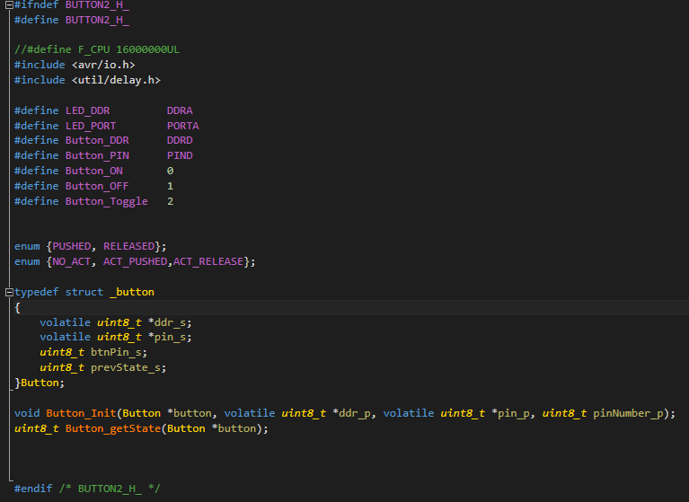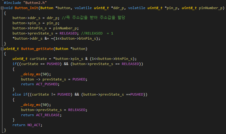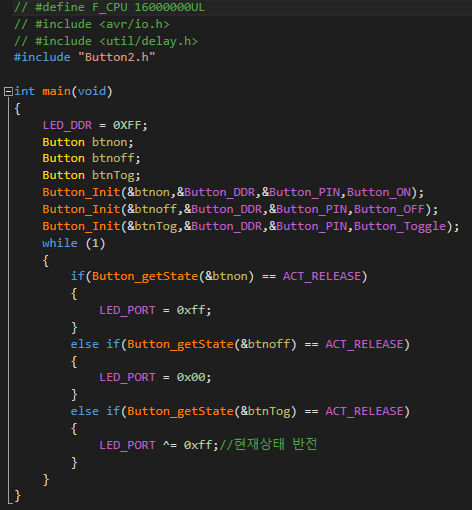 Button_Init함수로 3개의 버튼을 초기화 시킨다. 헤더파일에 Button_ON,Button_OFF,Button_Toggle 3가지를 매크로 설정을하여 PORTD의 0번 PIN(PD0)는 ON, 1번PIN(PD1)는 OFF, 2번PIN(PD2)는 Toggle 기능을 한다.
