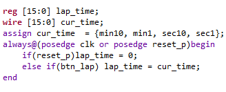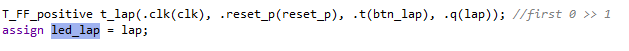 lap버튼을 누르면 T F/F의 입력으로 들어가 lap기능을 실행했습니다. 하지만 위에서 작성한 clear버튼을 실행시키면 clear가 되면서 스탑워치 카운터도 멈추지만 lap기능을 그대로 on 되어 있습니다. 이를 해결하기위해 T F/F의 인스턴스를 사용하는 것이 아닌 T F/F의 기능을 가져와 reset_p가 눌렸을때 lap = 0으로 lap버튼이 눌리면 lap을 반전시킵니다. 이렇게되면 사진처럼 lap의 값에따라 lap_time이 들어가거가, cur_time이 들어가는 기능을 그대로 사용할 수 있습니다. 그리고 clear가 눌렸을때 lap = 0 이되면서 lap도 기능이 off됩니다.