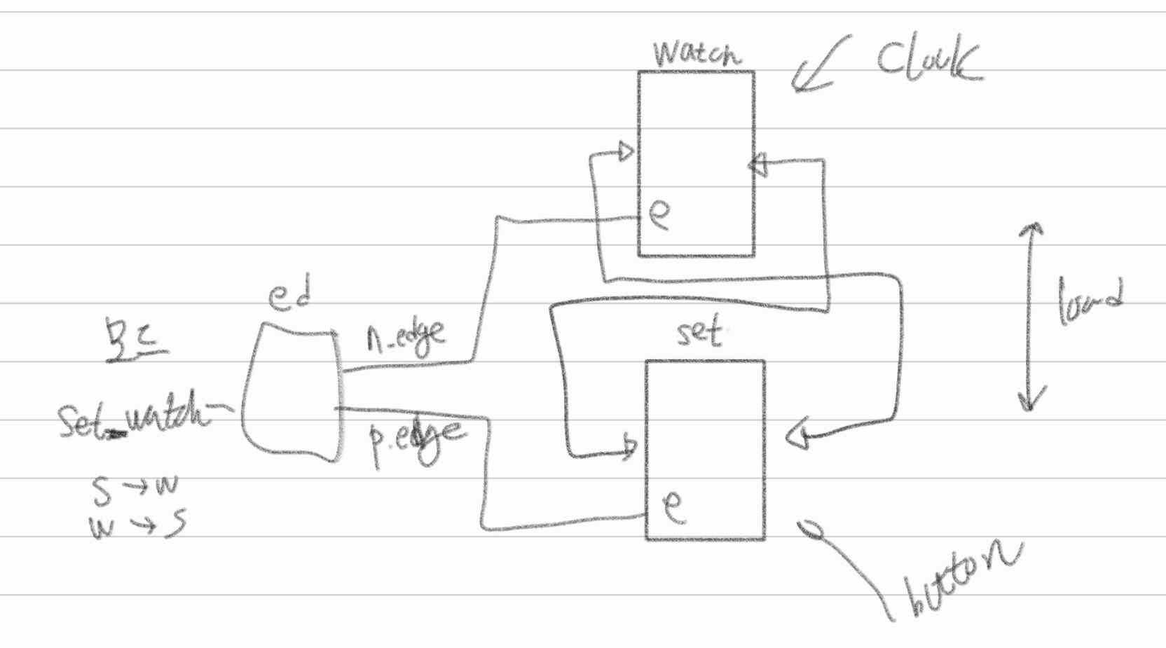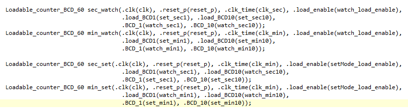 BCDCounter를 Loadable형식으로 만든다 이렇게하면 set과 watch모드는 서로다른 카운터를 사용한다. watch모드의 loadable카운터에는 load_BCD1,load_BCD10에 set모드의 sec, min을 연결해주고, Set모드의 loadable 카운터에는 load_BCD1,load_BCD10에 watch모드의 sec,min을 연결해준다. 이렇게 하면 enable신호를 받았을때 set모드에서 watch모드로 변경되었을때 set모드의 시간주기를 watch모드로 load하여 watch모드에서 set모드에서 설정한 시간주기로 timer를 시작할 것이다. 즉 카운터를 다르게해서 각자모드에 설정된 주기를 모드가 바뀌었을때 load하여 그 시간주기부터 timer가 시작된다. 모드가 바뀔때는 엣지디텍터로 원사이클 펄스를 감지해서 모드를 바꾼다! 이것이 상승엣지라면 watch모드가 활성화되고 하강엣지면 set모드가 활성화된다