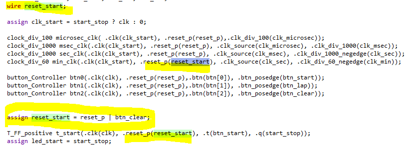 lap버튼을 누르고 클리어를 해주는 기능또한 추가했다. 원래 reset버튼이 존재하지만 reset버튼은 시스템을 초기화하는 기능이므로 clear기능을 따로추가해준다! clear버튼을 누르면 lap버튼을 누르고 lap_time에 저장된 시간을 FND에 표시해주고 클리어 버튼을 누르면 초기화가 된다. 하지만 이렇게되면 clock은 초기화가 되지않고 BCD카운터만 초기화되기 때문에 60주기 clock_div_60 또한 초기화 시켜줘야한다. 그렇다면 clock_div_60 의 리셋 에는 reset_p와 btn_clear 두개를 or연산 시켜 mux로 만든 reset_start를 연결시켜준다면 clear버튼을 누르면 60주기 clock_div_60까지 초기화 될 것이다!