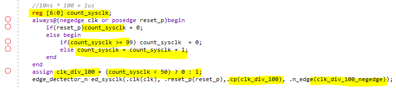 count_sysclk이 99 를 넘게되면 0으로 초기화되고clk_div_100의 값이 1이였다가 0으로 초기화되니 0으로 값이 바뀌면서clk_div_100_negedge에 하강엣지 원클락 펄스가 발생합니다.