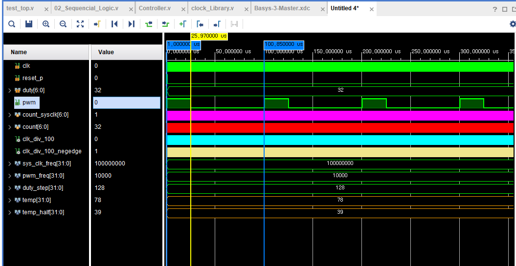 clk_div_100_negedge에 하강엣지 원클락 펄스가 발생 할 때마다count의 값이 올라가는 것을 볼 수 있습니다. 0~99까지 카운트되고 0~9까지 카운트 될때pwm = 1이되면서duty cycle = 10, 즉100us중10us는 1,90us는 0이되면서 1:9 비율로 dutyCycle 비율이 완성되는 것을 확인 할 수 있습니다.128주기 PWM