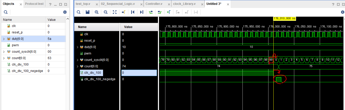 count_sysclk이 50 이하면clk_div_100의 값이 0임을 확인할 수 있고 50을 넘으면텍스트clk_div_100의 값이 1임을 확인할 수 있습니다.- 두번째 시뮬레이션 결과를 보면