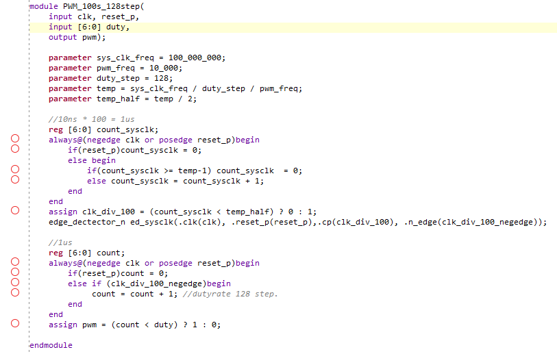즉,10ns = 100_000_000 (HZ = 100MHz)를1MHz(1us)로 만들어서 그1us(1MHz)를duty_step만큼 나누어 제어할 수 있다.(이 step이 많을수록 섬세하게 제어할 수 있습니다.)상세설명