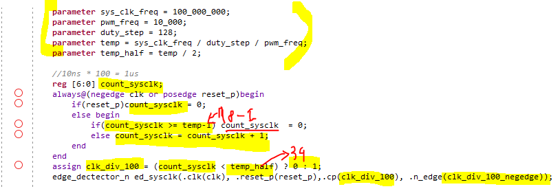 temp = 78이므로temp_half = 39입니다. 코드대로count_sysclk이temp_half를 보다 크다면clk_div_100은 1이 될것이고 작으면 0이됩니다 이를 이용해count_sysclk이 다시0이될때clk_div_100_negedge가 하강엣지에서 원클락펄스를 발생하게됩니다.clk_div_100_negedge가 발생될때마다count가 증가하고 이 우리가 설정한duty = 32값을 넘기면pwm이 0 이되고 이전에는 1이되면서pwm값을 제어합니다.
