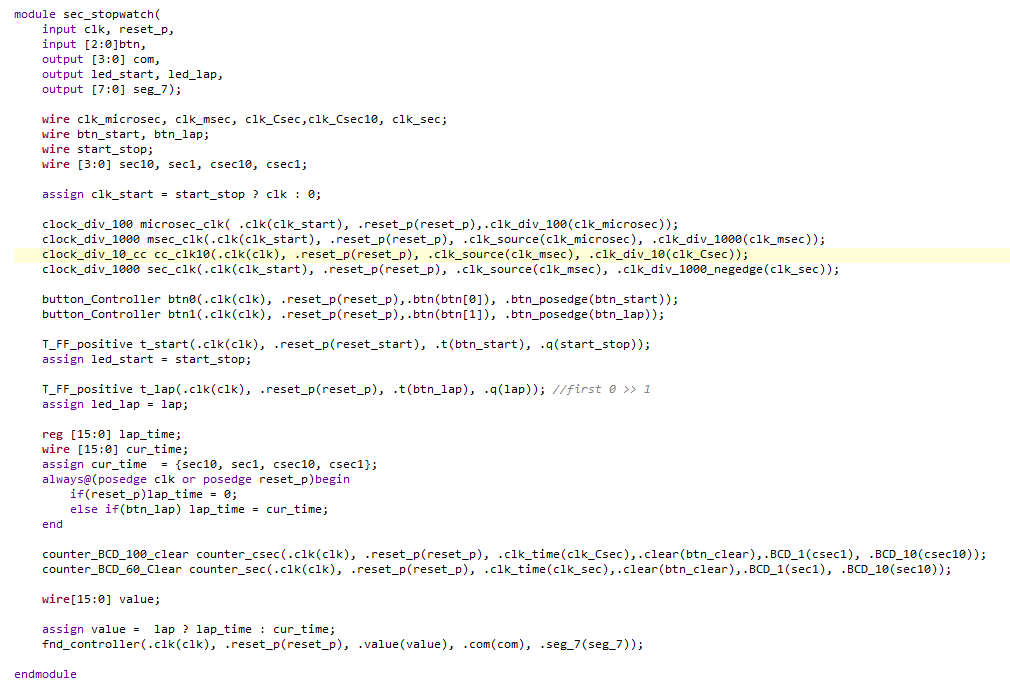 - 스톱워치의 버튼을 누르면 시간이 멈춰야하기때문에 시간을 카운트하는데 필요한 clk을 0으로 두면 clk을 멈춰 시간이 멈추게 할 수 있다. 주기를 초단위로 카운트해주는 clock_div의 주기는 스탑워치기능을 해야하므로 버튼을 누르면 주기가 멈춰야하므로 사진의 clk_start를 주기로 해줘서 T F/F의 출력 즉 버튼이 눌렸을 때 start_stop의 값에 따라 clk, 0이 들어간다.