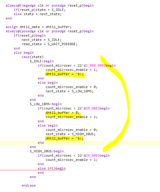 dht11_buffer가 하이임피던스가 되는 시점이 위의 사진과 다르다. 데이터시트의 논리대로 보면 S_HIGH_20US 시점에서 dht11_buffer의 출력이 하이임피던스가 되는것이 맞지만 어차피 S_LOW_18MS에서만 dht11_buffer가 출력이 0 이되니까 위처럼 선언해도 상관은 없다! 하지만 이 사진처럼 하는것이 데이터 시트의 논리대로 작성한 코드이다.
