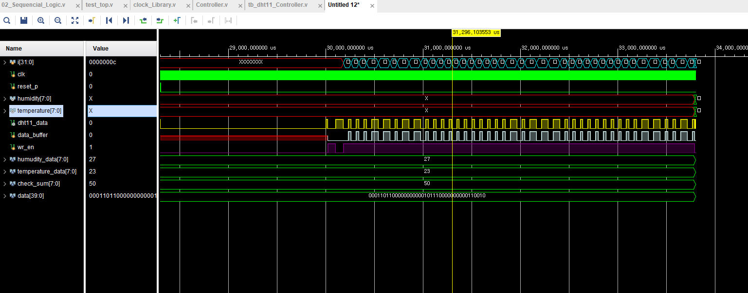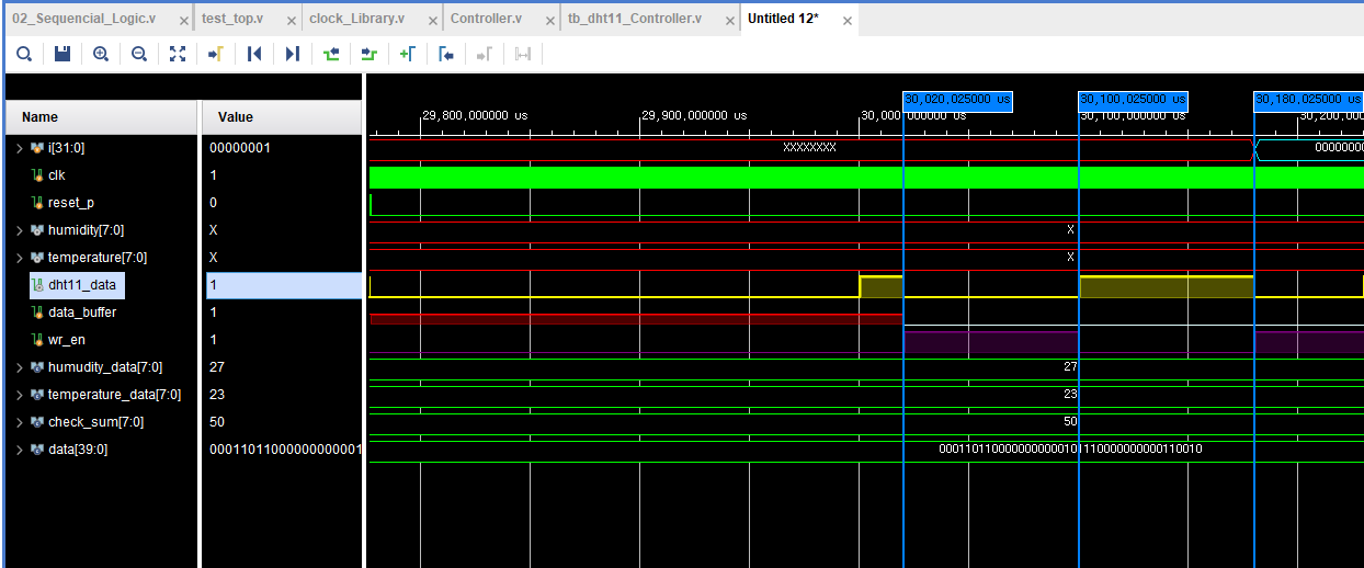 10ns 이후 data_buffer를 0으로 하고 wr_en을 0으로 합니다. 이러면 처음에 설정한 humidity_data와 temperature_data의 40bit의 값을 받아서 humidity[7:0], temperature[7:0]에 저장이되어서 값이 나오는 모습을 확인할 수 있습니다.