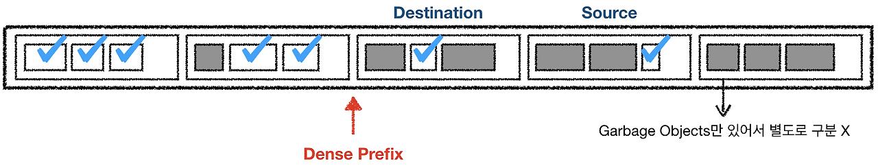 -> Dense Prefix 기준 왼쪽에 있는 Region은 GC 대상에서 제외되고, 오른쪽 영역의 Region에 대해 GC와 Compaction을 수행한다.