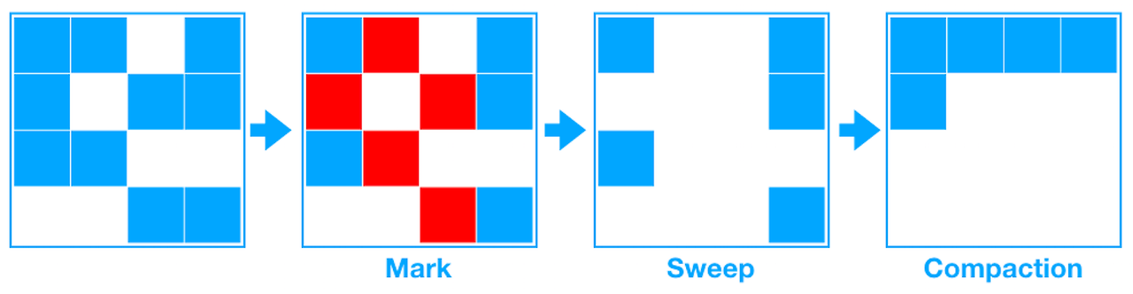 Old Generation에서는 이 Mark-Sweep 이후 단편화된 메모리를 압축시켜주는 Compact 단계가 추가된 Mark-Sweep-Compact 알고리즘을 사용해서 Full GC를 수행한다.