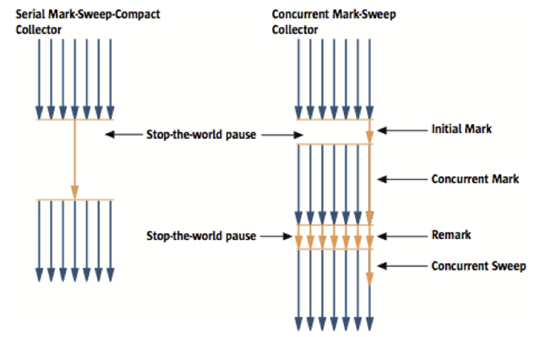 CMS (Concurrent Mark Sweep) GC는 Parallel GC와 멀티 스레드를 이용한다는 점은 같지만, Mark Sweep 알고리즘을 Concurrent하게 수행한다는 차이가 있다.