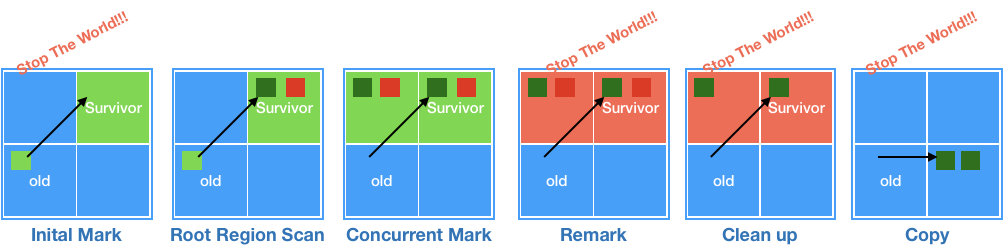 - 힙을 잠시 멈춰두고 모든 스레드들이 Region을 할당 받아 Compaction 작업을 수행한다. (이 때, Stop-The-World가 발생한다)