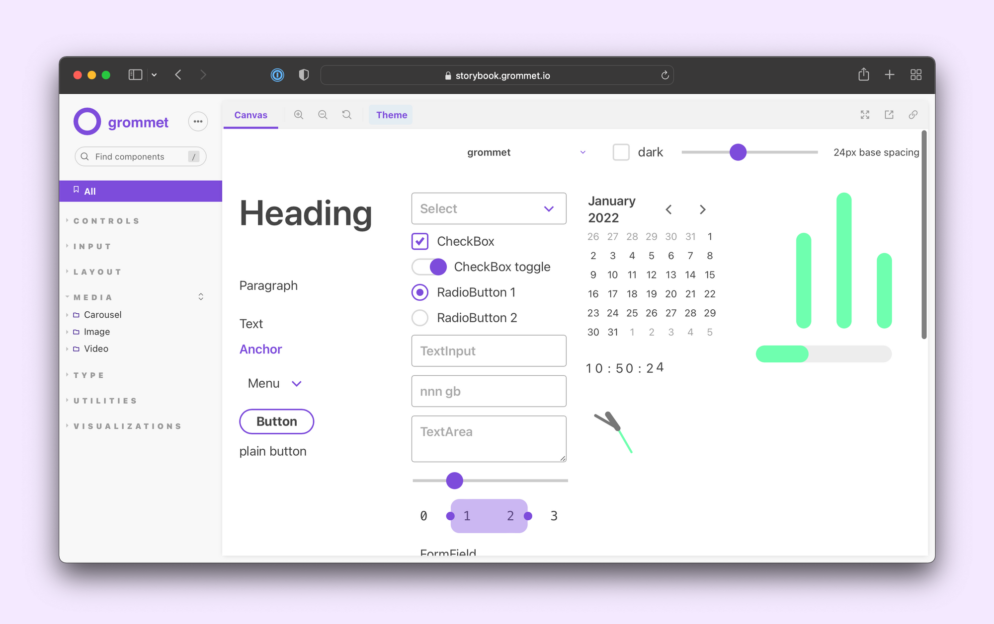 다음은 플레이그라운드 스토리입니다. 여기선 컴포넌트의 모든 props이 스토리북 컨트롤에 연결됩니다. 컴포넌트 API를 시연하고 브라우저 내에서의 프로토타이핑을 지원하는 데 도움이 됩니다.