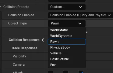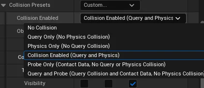 - Collision Enabled: 물리적 충돌과 쿼리 둘다 응답