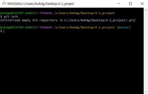 Git bash를 실행 해주고, cd명령어를 이용해 만들어둔 폴더로 이동한 후, Git init으로 초기화를 해준다.