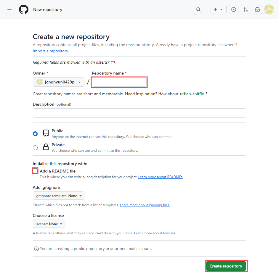 Repository name(저장소 이름)을 지정해주고, 편의성을 위해 Add a README file 추가를 클릭했다면, 생성할 준비가 완료된 것이다. 그 후 Create Repository를 클릭해준다.
