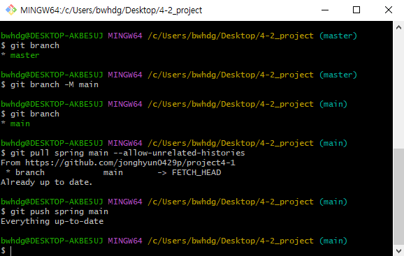 git pull [저장소 별명] main --allow-unrelated-histories (기록을 드문 상황에만 사용한다는 의미)