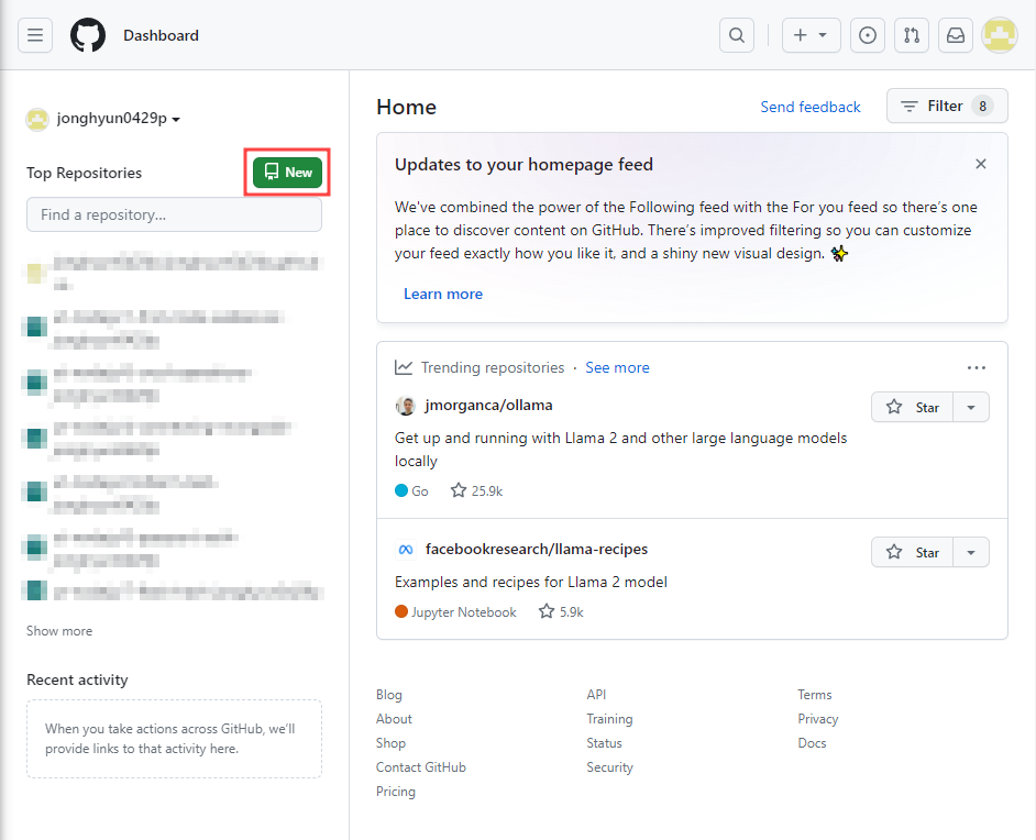 Github를 들어가고 로그인을 하게 되면 다음과 같은 화면을 보게 된다.