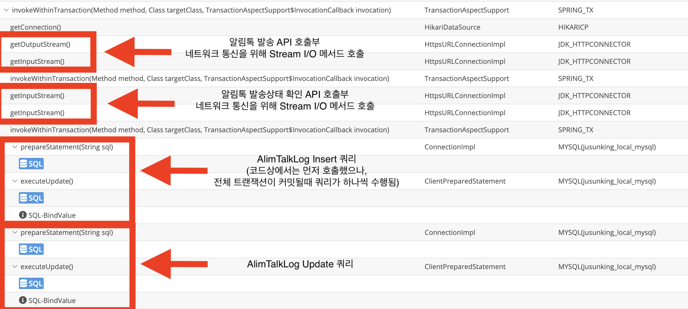 중요한 점은 이러한 HTTP 통신 메서드들이 invokeWithinTransaction 호출 이후, 즉 트랜잭션 내부에서 발생하고 있음