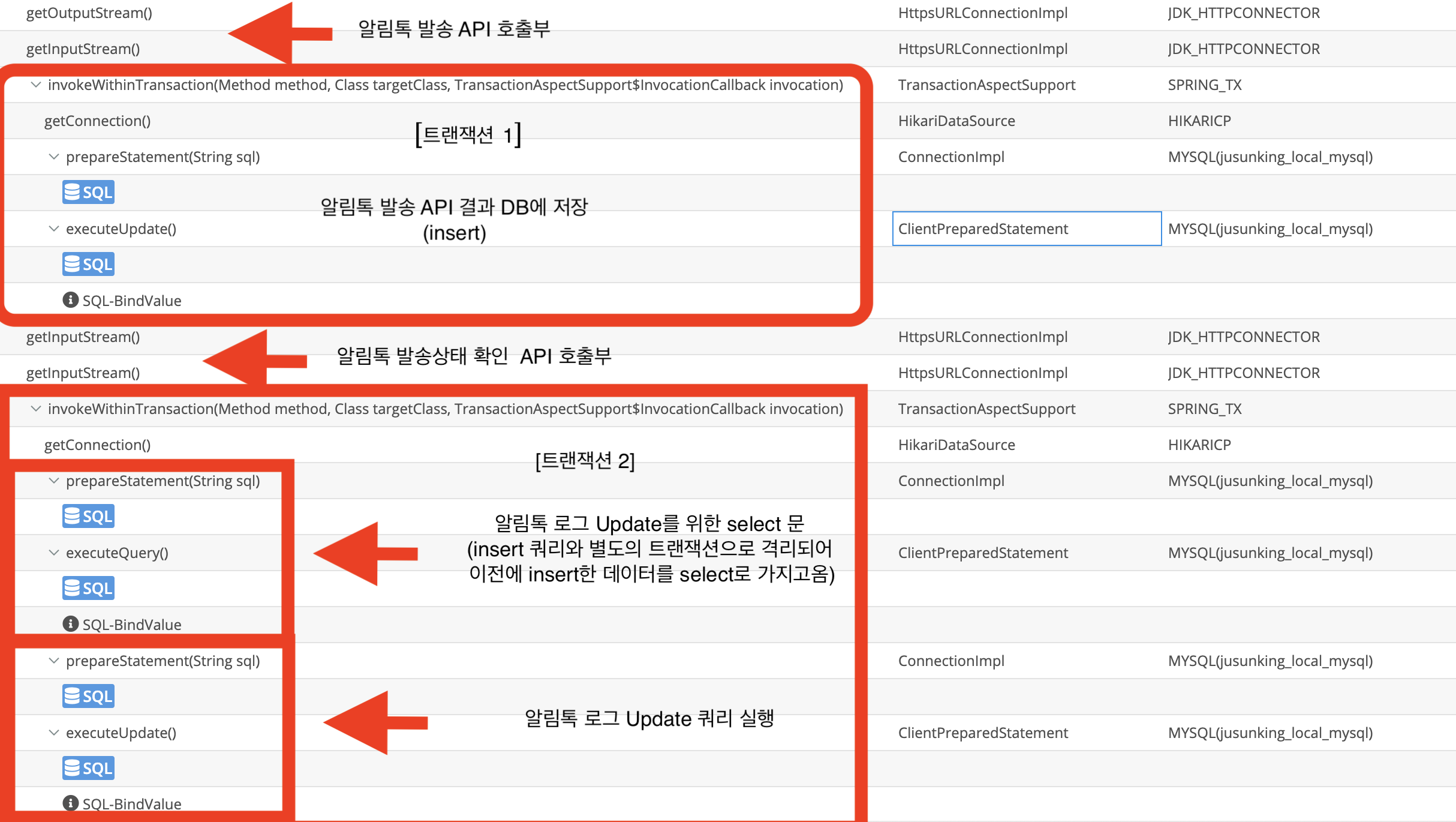 sendAlimTalkAndSaveLog()메서드가 호출되면 첫 번째 트랜잭션이 시작- 이 메서드 내에서