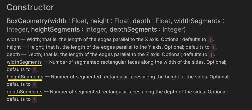 const geometry = new THREE.BoxGeometry(1, 1, 1, ⭐️, ⭐️, ⭐️);