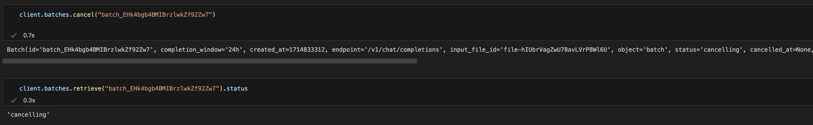 위 코드에 batch_id를 넣으면 요청이 취소되고 'status'가 'cancelling'으로 바뀐다.