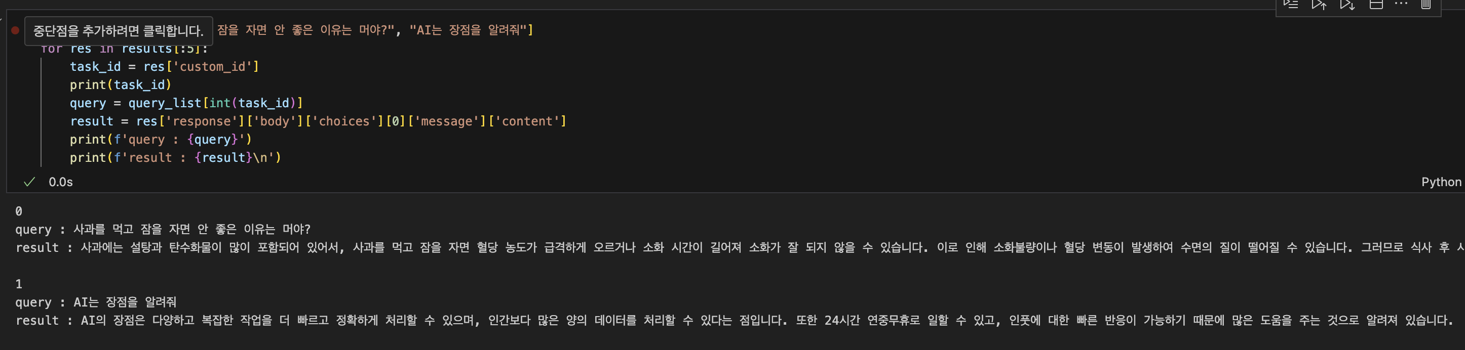 다만 OpenAI의 공식문서에도 result는 list의 순서는 보장되어 나오지 않으니 custom_id를 기반으로 미리 저장해둔 질문과 매칭시켜서 잘 읽도록 하자.