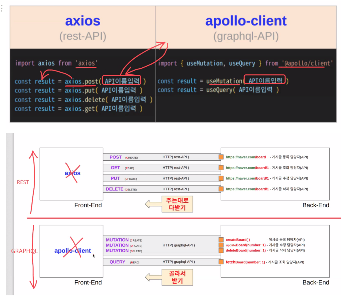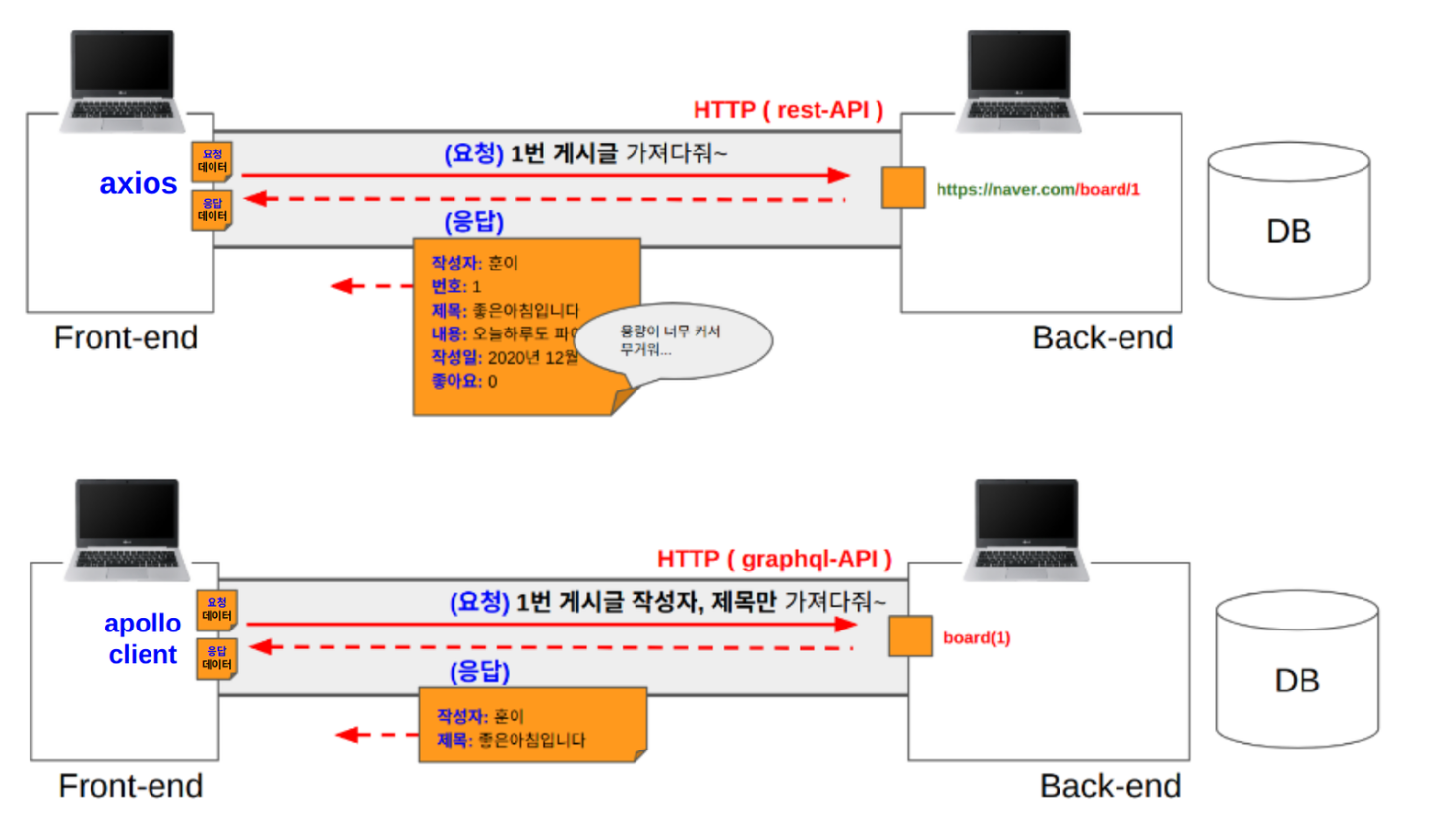 반면에,GraphQL-API는 back-end 개발자가 만든 함수에서 필요한 데이터만 골라 받을 수 있습니다.