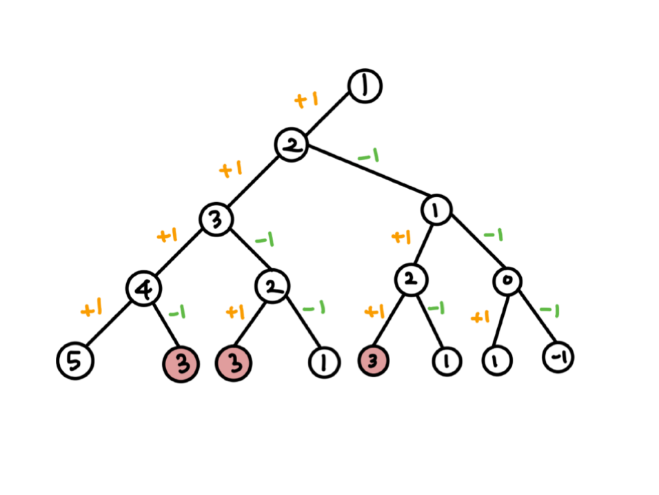 트리 모양을 생각해서 왼쪽 노드는 +를 해주고 오른쪽 노드는 -를 한다.