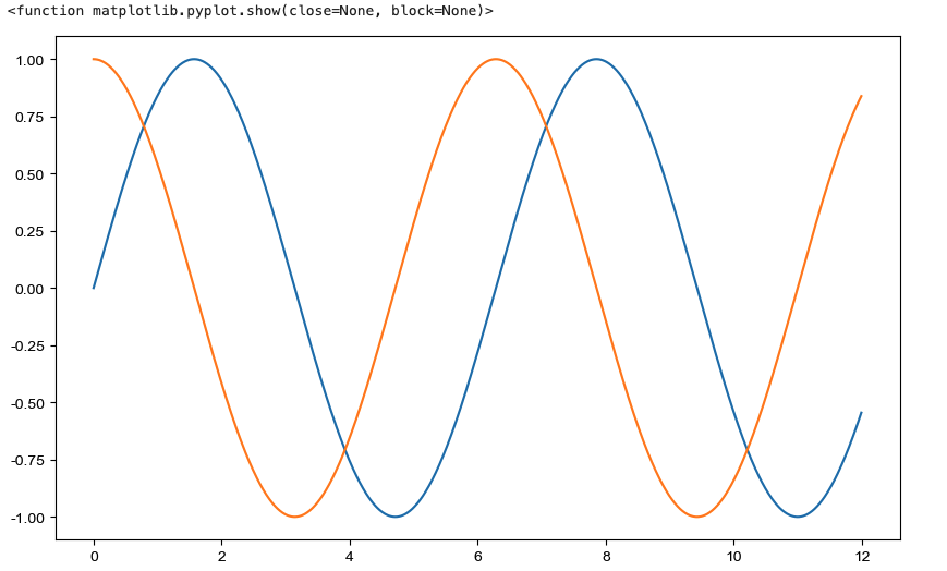 figure사이즈를 설정하고, plot형태로 (1)x축: t, y축: np.sin(t) / (2)x축: t, y축: np.cos(t)로 나타내 두가지의 그래프를 입력하여 마지막엔 객체에 저장해 이 내용들을 그래프로 보여준다.