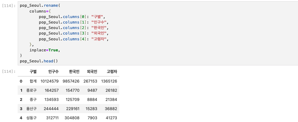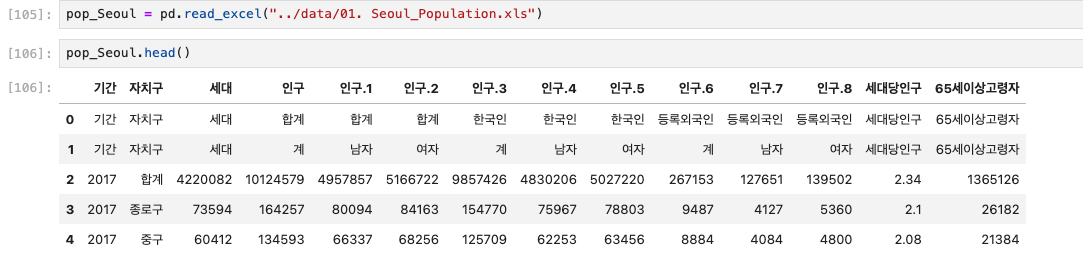 위와 마찬가지로 파일을 popSeoul이라고 변수명을 정해주고, "모듈.read확장자(파일명)" 명령으로 파일을 읽을 수 있다.
