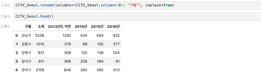 CCTV_Seoul.rename(columns={CCTV_Seoul.columns[0]: "구별"}, inplce=True)