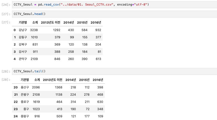 파일을 CCTVSeoul이라고 변수명을 정해주고, "모듈.read확장자(파일명)" 명령으로 파일을 읽을 수 있다. 긴 파일명의 경우 끝까지 입력하지말고 적당한 곳에서 tab키를 눌러주면 자동으로 파일명이 완성된다. 한글의 경우 encoding 설정이 필수이므로 아래와 같이 encoding="uft-8" 을 꼭 타이핑해주자!
