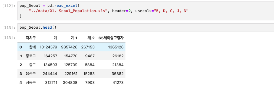 "../data/01. Seoul_Population.xls", header=2, usecols="B, D, G, J, N"