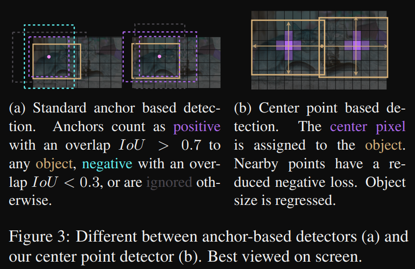 (b) : 중심점이 based인 detection이다. 중심 픽셀은 객체에 할당되어진다. 중심 주변의 픽셀들은 감소된 negative loss를 가지게 되며 물체의 크기는 regression을 통해 계산된다.