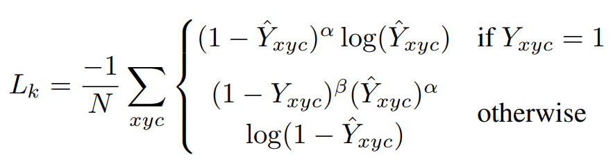 α와 𝛽는 Focal Loss의 hyperparameter이며 N은 이미지내의 keypoint 갯수이다. N으로 normalization을 하는 이유는 positive focal loss instance가 1이 되도록하기 위함이다.α는 2, 𝛽는 4를 사용한다.