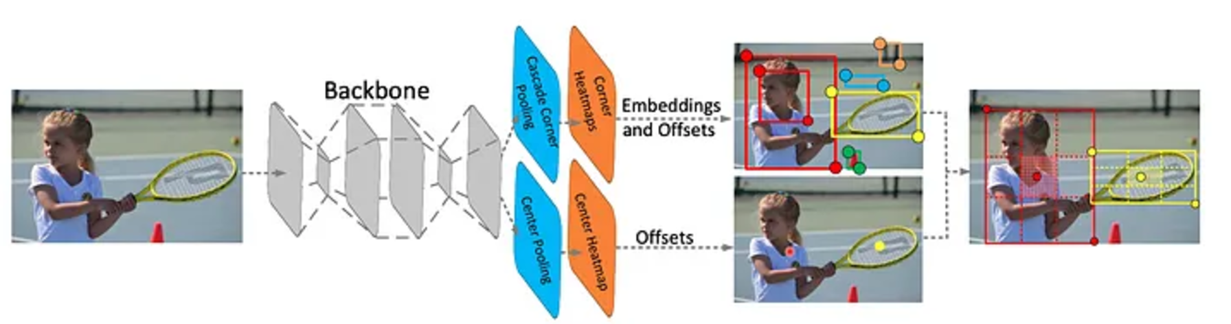 두가지의 task를 진행한다. Cascade Corner pooling을 통해 object의 corner 영역을 찾고 Center pooling을 통해 object의 center를 추적한다.