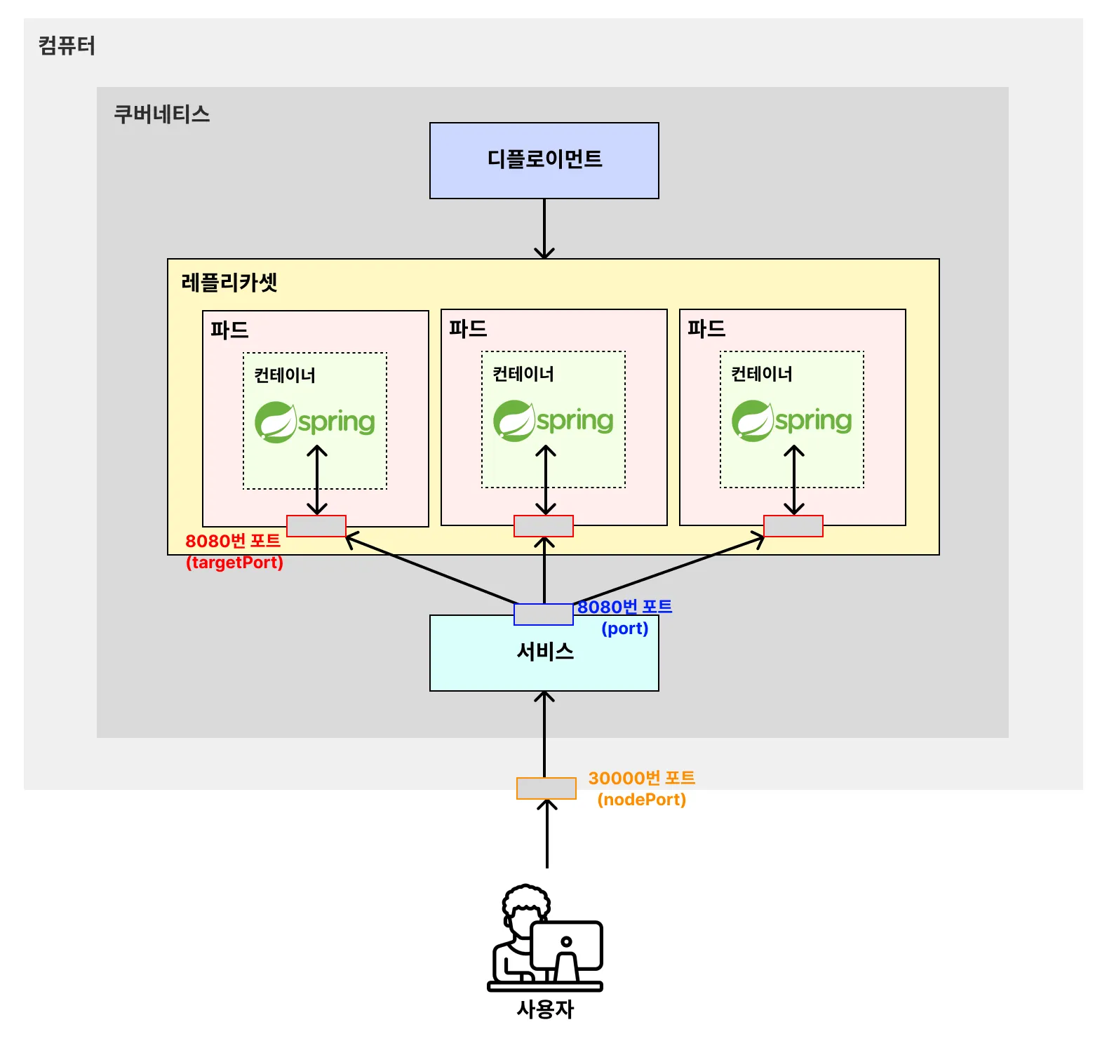 nodePort: 30000 # 외부에서 접근할 포트 (30000~32767 사이) - 기본 할당 포트 범위