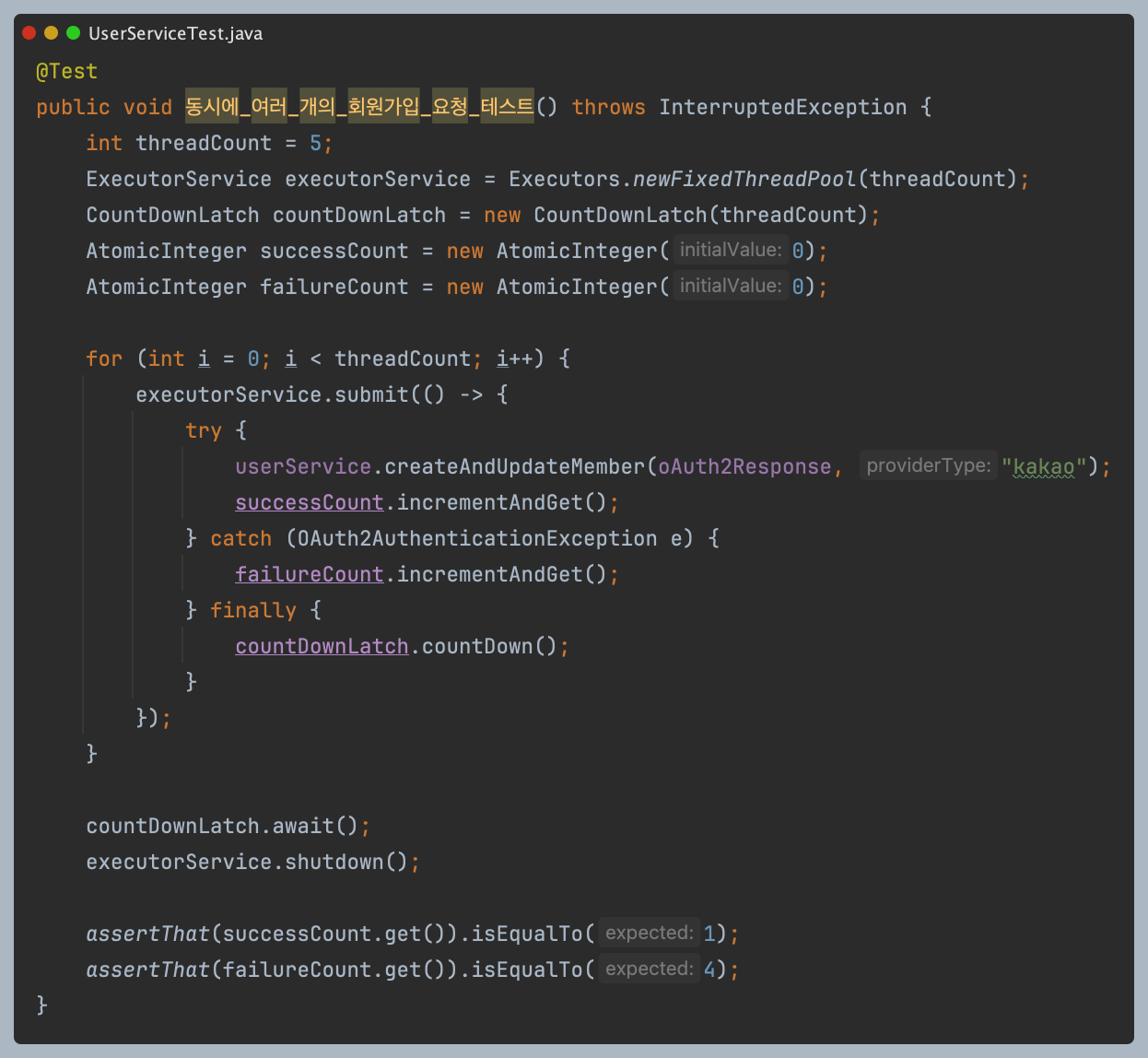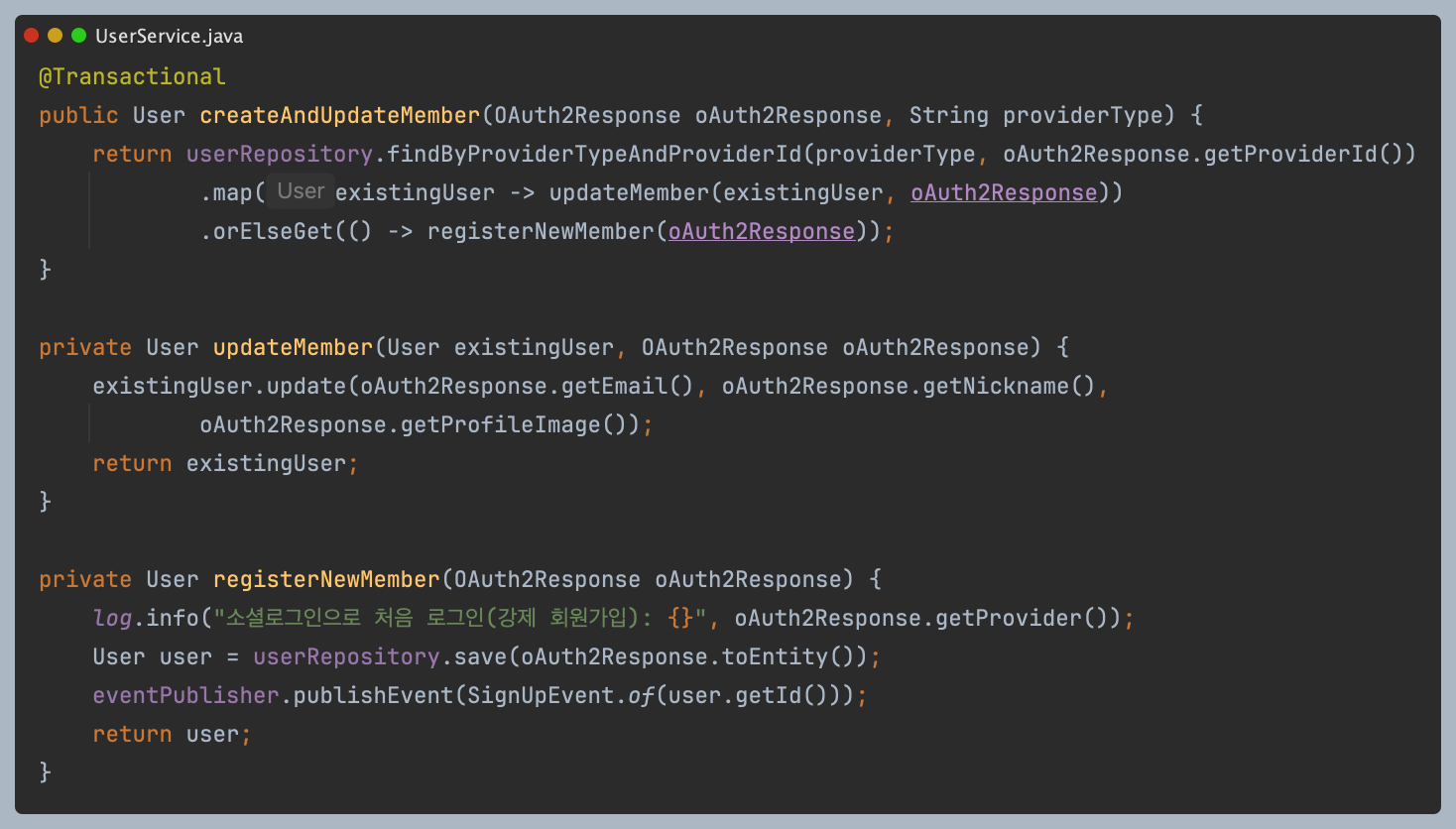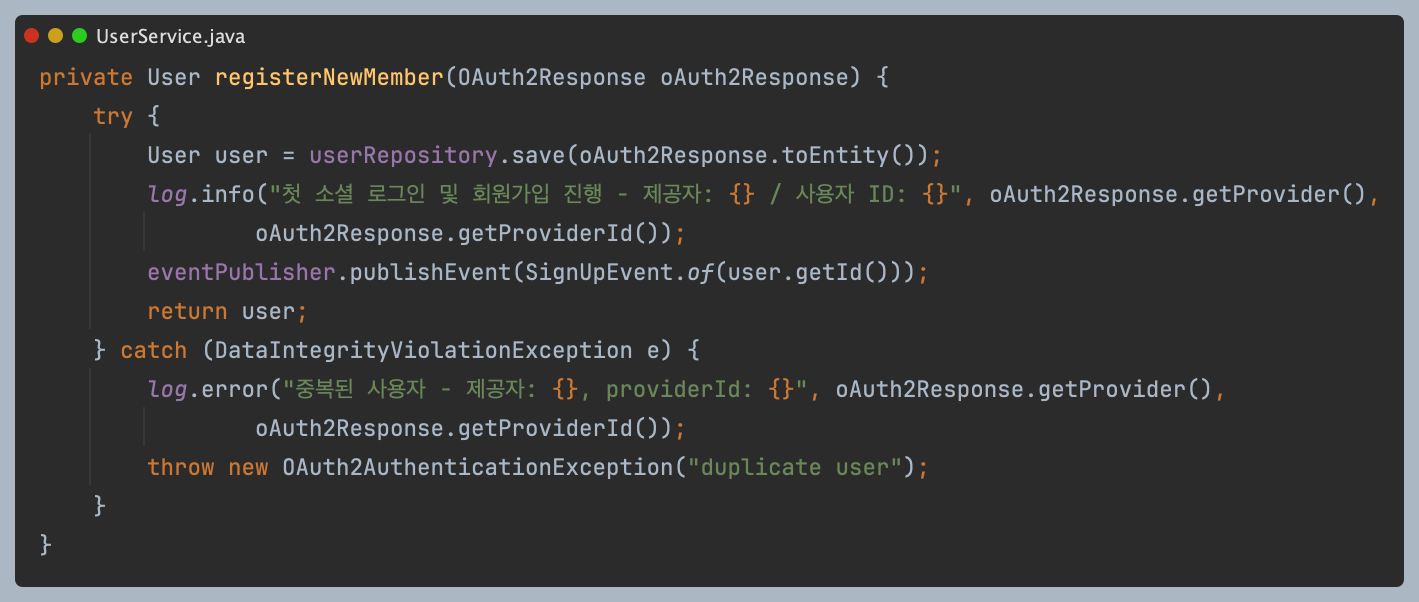 이 문제는 회원가입 시 기존 회원 여부를 체크한 후, 회원이 아니면 회원으로 등록하는 로직에서 발생했다.