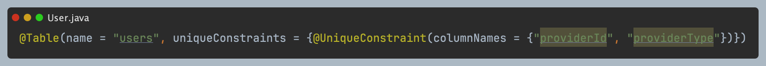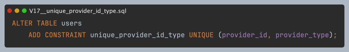- Unique 제약조건을 적용해 providerId + providerType 조합의 중복 등록을 방지함