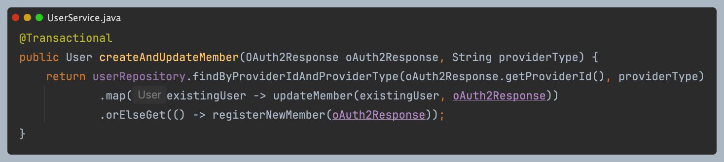 - Named Lock이나 Redis 분산락을 통해 providerType + providerId 조합으로 락을 생성해 해당 메서드 실행 시 해당 키에 해당하는 락을 점유해 중복 요청 방지